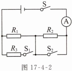 例2 如图17 - 4 - 2所示的电路中,电源电压保持不变,$R_{1} = R_{2} = R_{3} = 20\ \Omega$,当开关S闭合,$S_{1}$、$S_{2}$断开时,电流表的示数是0.3 A,求: