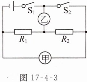 例3 (2023沈阳沈河区校级期末)如图17 - 4 - 3所示,电源电压保持不变,$R_{1}$、$R_{2}$为定值电阻。若开关$S_{1}$、$S_{2}$闭合,甲、乙两表均为电压表,示数之比为5∶2,则$R_{1}$、$R_{2}$的电阻之比为________;若开关$S_{1}$闭合、$S_{2}$断开,两表均为电流表,则甲、乙两表的示数之比为________。