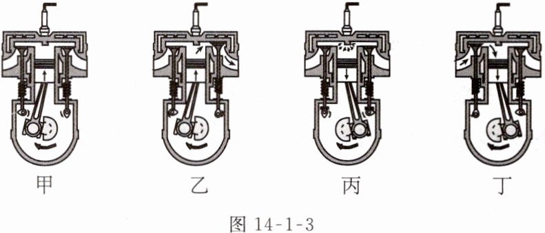 例3 如图14-1-3所示是给汽车提供动力的汽油机的四个工作冲程。下列判断中错误的是 ( )