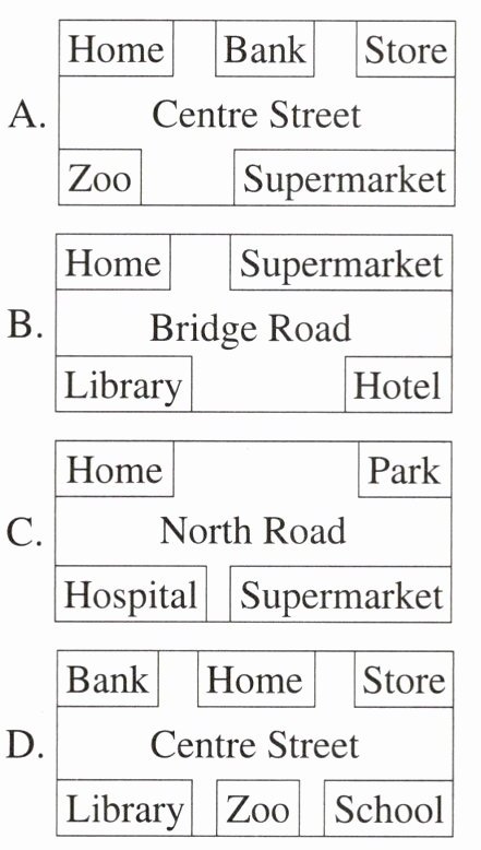 37.A 图文结合题。根据第二栏的内容可知,在Mike家和商店中间有一家银行,且提到了一个动物园,结合四个图片只有A项符合。