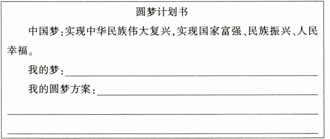 是国家的梦、民族的梦,也是每个中国人的梦。同学们纷纷表示,要共圆中国梦,共享美好人生。请你就此完成自己的圆梦计划书。(8分)
