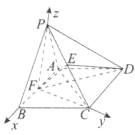 PAB∩平面ABCD=AB,PFC平面 PAB,所以PF⊥平面ABCD.连接 AC,因为AB=BC,∠ABC=60°,所以△ABC是等边三角形,所以CF⊥AB.以F为坐标原点,建立空间直角坐标系Fxyx(如图所示).由题意得F(0,0,0),P(0,0,$\frac{\sqrt{3}}{2}$),D(−1,$\frac{\sqrt{3}}{2}$,0),c(0.$\frac{\sqrt{3}}{2}$,o),因为E是PC的中点,所以E(0,$\frac{\sqrt{3}}{4}$,$\frac{\sqrt{3}}{4}$. 故FE=(0,$\frac{\sqrt{3}}{4}$,$\frac{\sqrt{3}}{4}$),FD=(−1,$\frac{√3}{2}$,0), 设平面DEF的法向量为m=(x,y,Z), m.FE=0, $\frac{\sqrt{3}}{4}$y+$\frac{\sqrt{3}}{4}$x=0, 则{m.FD=0,即 −x+$\frac{\sqrt{3}}{2}$y=0. { 令y=2,则x=$\sqrt{3}$,x=−2. 所以平面DEF的一个法向量为m=($\sqrt{3}$,2,−2).