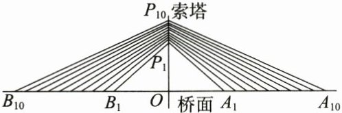 15.(直观想象)斜拉桥是桥梁建筑的一种形式,在桥梁平面上有多根拉索,所有拉索的合力方向与中央索塔一致. 如图,一座斜拉桥共有10对永久拉索,在索塔两侧对称排列. 已知拉索上端相邻两个锚的间距$\vert P_iP_{i + 1}\vert(i = 1,2,3,\cdots,9)$均为4.4 m,拉索下端相邻两个锚的间距$\vert A_iA_{i + 1}\vert(i = 1,2,3,\cdots,9)$均为16 m. 最短拉索的两个锚$P_1$,$A_1$满足$\vert OP_1\vert = 57$ m,$\vert OA_1\vert = 86$ m,则最长拉索所在直线的斜率为 ( )