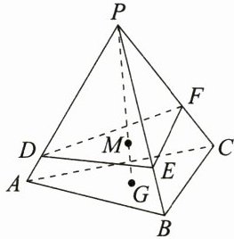 14. 如图,在三棱锥$P - ABC$中,点$G$为$\triangle ABC$的重心,点$M$在$PG$上,且$PM = 3MG$,过点$M$任意作一个平面分别交线段$PA$,$PB$,$PC$于点$D$,$E$,$F$,若$\overrightarrow{PD}=m\overrightarrow{PA}$,$\overrightarrow{PE}=n\overrightarrow{PB}$,$\overrightarrow{PF}=t\overrightarrow{PC}$,求证$\frac{1}{m}+\frac{1}{n}+\frac{1}{t}$为定值,并求出该定值.