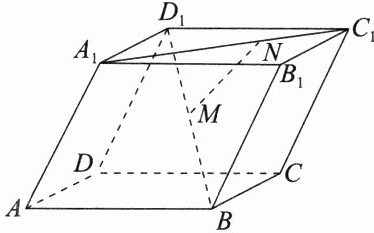 10. 如图所示的平行六面体$ABCD - A_{1}B_{1}C_{1}D_{1}$中,$AD = AA_{1}=AB = 1$,$\angle A_{1}AB=\angle DAB=\angle DAA_{1}=60^{\circ}$,$\overrightarrow{A_{1}C_{1}} = 3\overrightarrow{NC_{1}}$,$\overrightarrow{D_{1}B}=2\overrightarrow{MB}$,设$\overrightarrow{AB}=\boldsymbol{a}$,$\overrightarrow{AD}=\boldsymbol{b}$,$\overrightarrow{AA_{1}}=\boldsymbol{c}$.