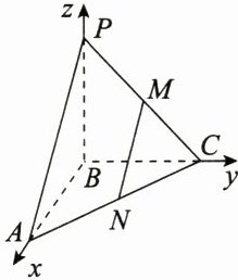 解析 连接BM,BN,则$\overrightarrow{MN}=\overrightarrow{BN}-\overrightarrow{BM}=\frac{1}{2}(\overrightarrow{BA}+\overrightarrow{BC})-\frac{1}{2}(\overrightarrow{BP}+\overrightarrow{BC})=\frac{1}{2}\overrightarrow{BA}-\frac{1}{2}\overrightarrow{BP}=\frac{1}{2}i + 0j-\frac{1}{2}k$,即$\overrightarrow{MN}=(\frac{1}{2},0,-\frac{1}{2})$。