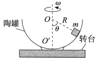 5. (2024·北京铁路二中期中)如图所示,半径为R的半球形陶罐,固定在可以绕竖直轴旋转的水平转台上,转台转轴与过陶罐球心O的对称轴OO'重合。转台以一定角速度ω匀速旋转,一质量为m的小物块落入陶罐内,经过一段时间后,小物块随陶罐一起转动且相对罐壁静止,它和O点的连线与OO'之间的夹角θ = 53°。cos53° = 0.6,sin53° = 0.8,重力加速度为g。