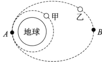 3.(2024·安徽阜阳期中)如图所示,地球的两颗人造卫星甲、乙分别在圆轨道、椭圆轨道上运动,$A$、$B$分别是椭圆轨道的近地点、远地点,与地心的距离分别为$r$、$3r$,两轨道相切于$A$点,则甲、乙卫星的公转周期之比为( )