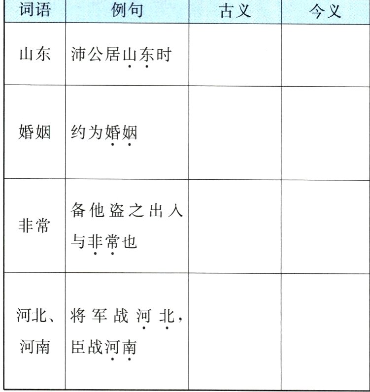 4. 古今异义答案:崤山以东,泛指东方六国之地/山东省 亲家,有婚姻关系的亲戚/结婚的事;因结婚而产生的夫妻关系 意外的变故/形容词,异乎寻常的,特殊的;副词,十分,极 黄河以北;黄河以南/河北省;河南省