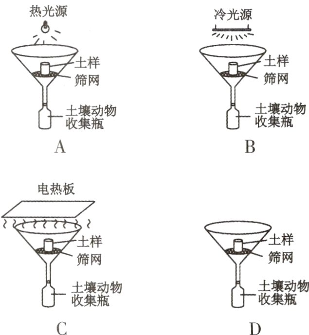 7. 土壤动物具有趋暗、趋湿、避高温的习性。下列4种土壤小型节肢动物的分离收集装置,最合理的是( )