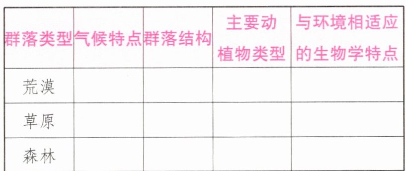 阅读教科书中荒漠、草原和森林生物群落相关内容,找出三种类型生物群落在气候特点、群落结构和物种组成上的差异。思考下列问题: