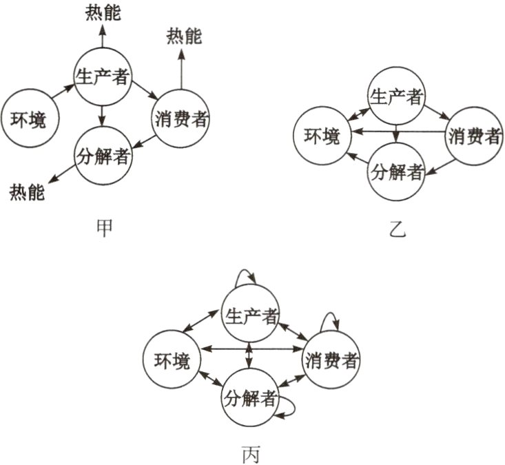 9. 甲、乙、丙三个模型图可表示生态系统的功能,依次为 ( )