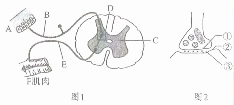 6. 下图 1 是当 A 接受一定强度刺激后引起 F 收缩的过程示意图,图 2 为图 1 中 D 结构的放大示意图。请回答下列问题。