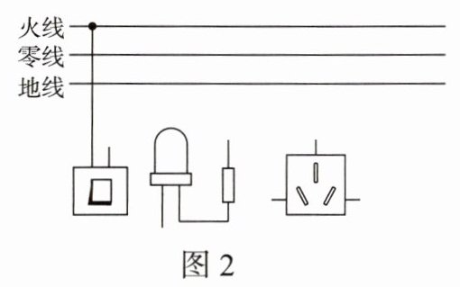 2.生活中有一种插线板,在使用中发现:插线板上的指示灯在开关断开时不发光,插孔不能提供工作电压;而在开关闭合时指示灯发光,插孔可以提供工作电压;如果指示灯损坏,开关闭合时插孔也能提供工作电压。根据上述现象,请在图2中画出开关、指示灯和插孔的连接方式,并与电源线或地线接通。
