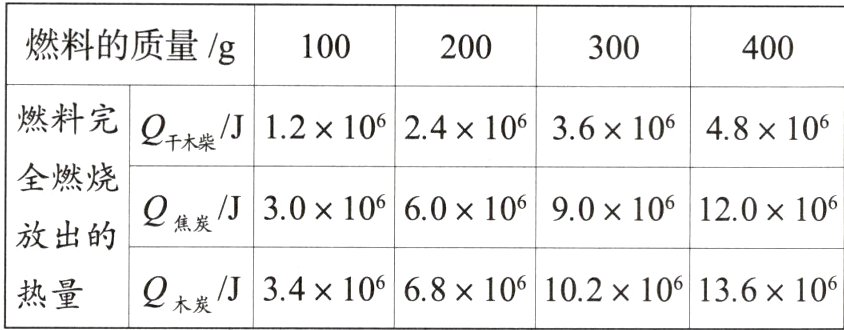 1. 干木柴、焦炭、木炭等都是常用的燃料,对它们取不同质量进行完全燃烧,得到了下表的数据: