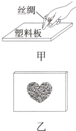 12. (2024·保定高碑店期末)如图15 - 1 - 5甲所示,小明在透明塑料板下放了一张爱心的图案,用丝绸裹住手指,照着图案用力摩擦塑料板后,均匀撒上干木屑,竖起塑料板轻敲,板上留下了一个由木屑组成的爱心图案,如图乙所示,这个过程模拟了静电复印。下列说法正确的是( )