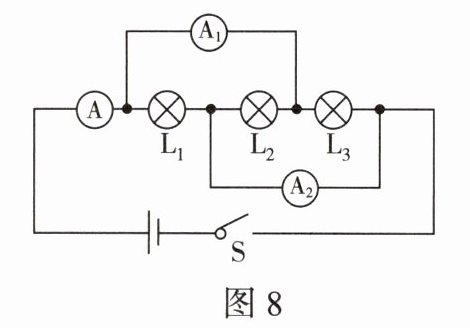 8. 如图8所示电路,当开关S闭合时,电流表A、A₁、A₂的示数分别为0.9A、0.7A、0.5A,则下列判断正确的是( )