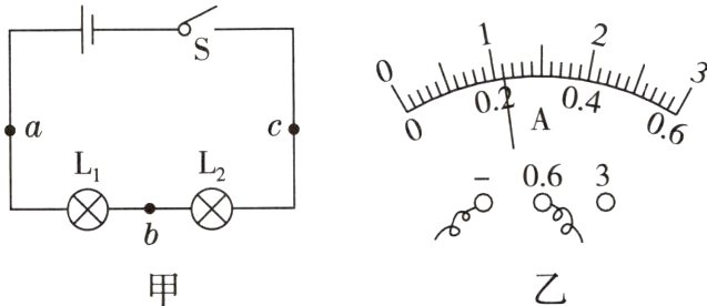 12. 在“探究串联电路的电流特点”的实验中,小丽同学选用两个不同的小灯泡组成了如图12甲所示的串联电路,然后用一个电流表分别接在a、b、c三处去测量电流: