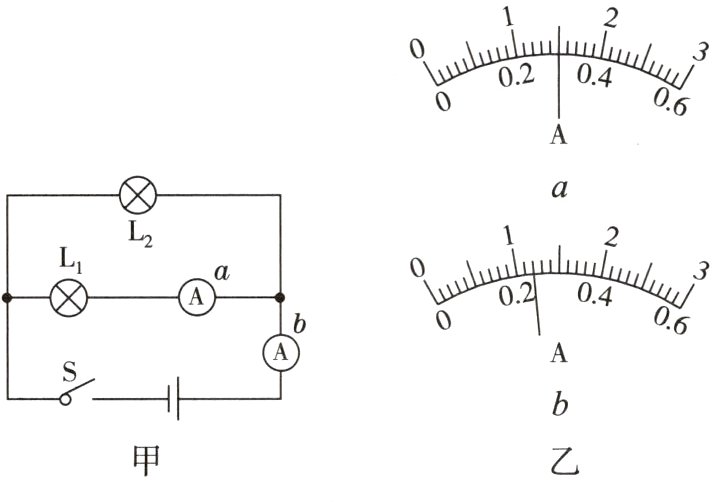 9. 如图9甲电路,当开关S闭合后,电流表的指针偏转如图乙所示,其中a电流表测量的是通过_______的电流,通过灯泡L₂的电流为_______。