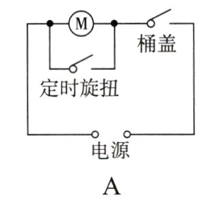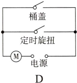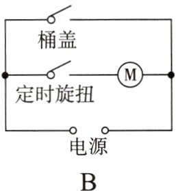 6. 双桶洗衣机用电动机带动甩干桶来给衣服脱水,只有当拧动定时旋钮后且桶盖关闭时电动机才能工作,它由两个开关控制,一个是定时旋钮,拧动时开关闭合,恢复时开关断开;另一个是桶盖触动开关,为了保证人的安全,把桶盖打开时,开关断开而自动断电,下列电路的设计符合要求的是( )