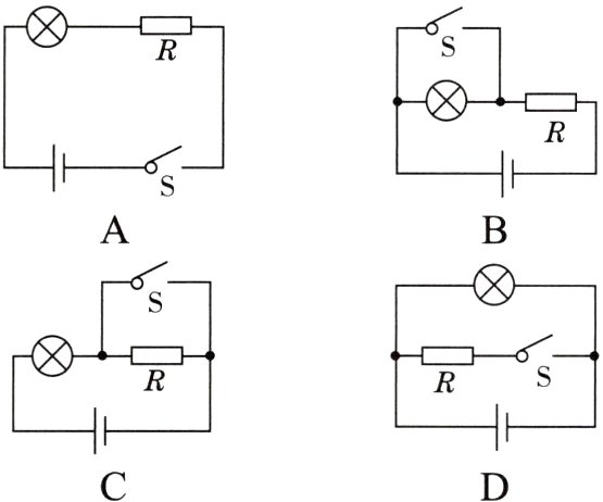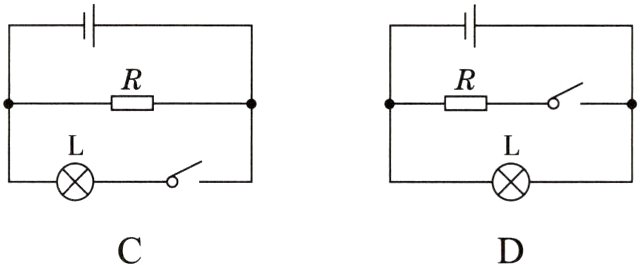 1. 某电热水壶正常状态下,断开开关,指示灯L熄灭,电热丝R不工作;闭合开关,指示灯L亮,同时电热丝R工作。小明用该电热水壶烧水时,发现电热丝R断了,指示灯L仍然亮。四位同学设计了该电热水壶的模拟电路,其中可能正确的是( )