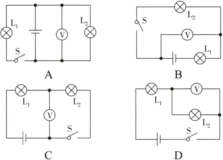 1.在下列电路中,闭合开关S,能用电压表测量L₁两端电压的正确电路是( )