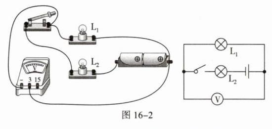 11. 如图16 - 1 - 6所示电路中,开关闭合后电压表测量的是______两端的电压。若要使电压表测量灯L₁两端的电压,只需要将导线______(填表示导线的数字)的右端改接到______(填表示接线柱的字母)接线柱上即可。