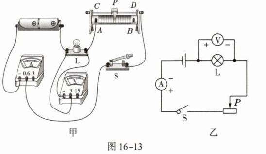 (1)要求电压表测灯泡两端的电压,电流表测通过灯泡的电流,且当滑片P向左滑动时,电流表示数变大,在图16 - 4 - 6乙虚线框内画出电路图,标出电压表、电流表的正、负接线柱,并用笔画线代替导线将如图甲所示的实物连接好。