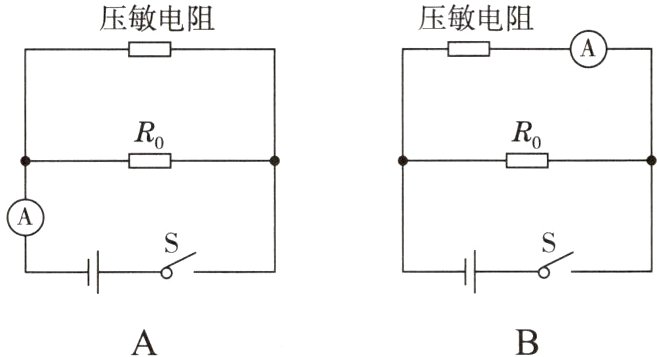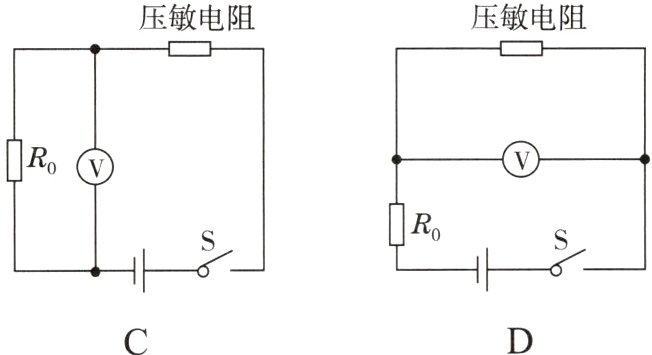 13. 压敏电阻的阻值是随所受压力的增大而减小的。小聪同学想设计一个通过电表示数反映压敏电阻所受压力大小的电路,要求压力增大时,电表示数增大。以下电路不符合要求的是( )