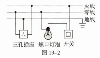 15. (2023·邯郸期末)请用笔画线代替导线在图19−1−12中连接家庭电路,要求开关控制螺口灯泡,三孔插座直接接入电路。