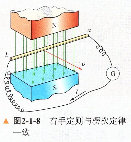 问题2 在图2−1−8中,导体ab与电流表用导线连接成闭合回路,ab沿图示方向运动,请用楞次定律判定导体ab中的感应电流方向。