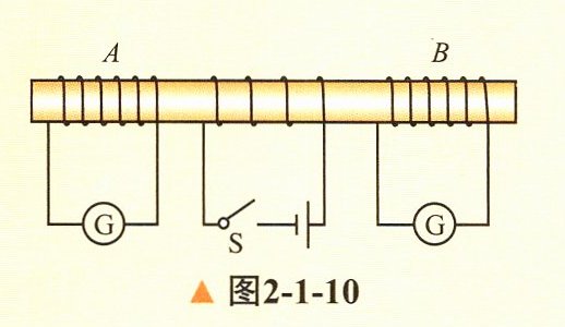 2. 如图2−1−10所示,当S接通或断开时,线圈A、B中分别产生了什么方向的感应电流?