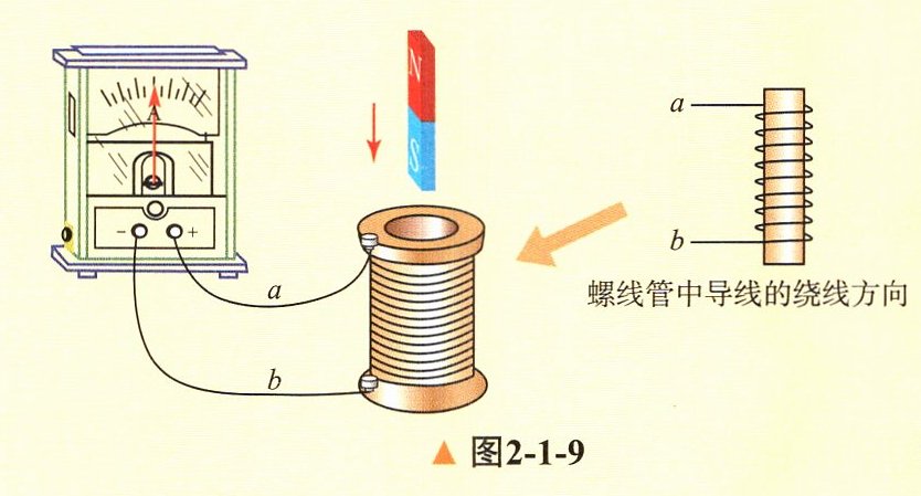 1. 如图2−1−9所示,将条形磁铁插入螺线管中,回路中产生了感应电流,使电流表指针偏转,试判断电流表指针的偏转方向。
