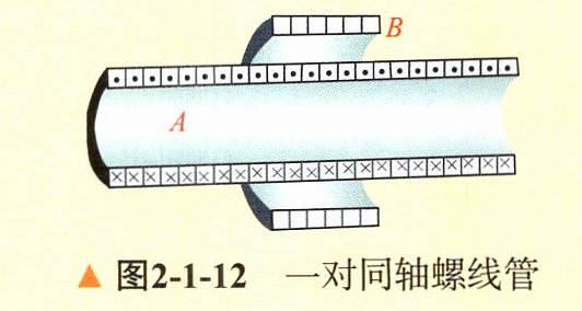 4. 图2−1−12表示一对同轴螺线管,图中线圈A中的电流方向用“.”和“×”表示,请画出两条线圈A磁场的磁感线,再分析如果线圈A中的电流增大或减小,则线圈B中的感应电流分别为什么方向(用“.”或“×”表示)。