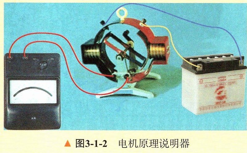 2. 将电机原理说明器与零刻度线居中的电流表相连,如图3−1−2所示。缓慢、匀速转动手柄,可以看到电流表指针如何摆动?这又说明了什么?