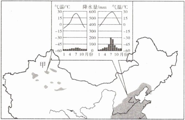 棉花是春季播种,夏秋季成熟的作物。如图示意我国棉花的两大优势生产基地(阴影部分)及甲、乙两地气候资料统计。读图,完成10~12题。