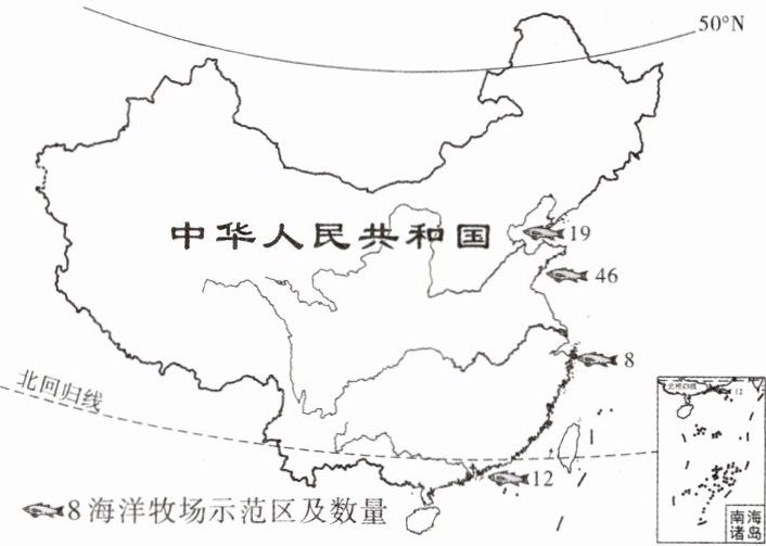 海洋牧场是将人工培育的海洋生物聚集在一定海域内,进行有计划放养的新兴生产方式。如图示意国家级海洋牧场示范区在四大海域的分布。读图,完成3~5题。