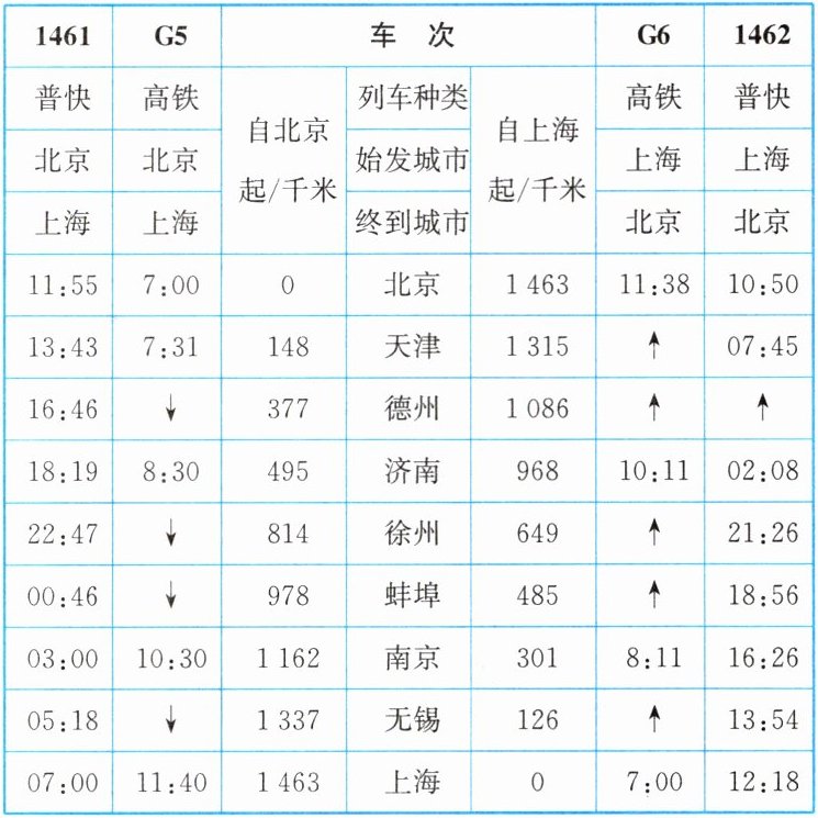 (2)从上海出发到北京,乘坐普快比乘坐高铁所需要的时间长约______(填整数)个小时。