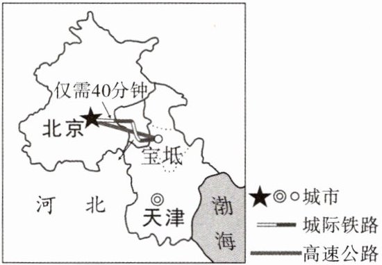 (2024.河南)2024年是京津冀协同发展10周年。天津市宝坻区依托京津中关村科技城建设,形成了“创新研发在北京,成果转化在宝坻”的合作模式。如图为宝坻区位置示意图。据此完成10~11题。