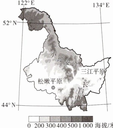(2024.广东)黑龙江省土地面积广阔,是我国推行“北斗十智慧农业”生产模式的试点省份。该生产模式通过使用“北斗”和搭载“智慧大脑"的农机,可自动进行精准的整地、播种、施肥、喷药、收获等作业。读黑龙江省地形分布图,完成7~9题。