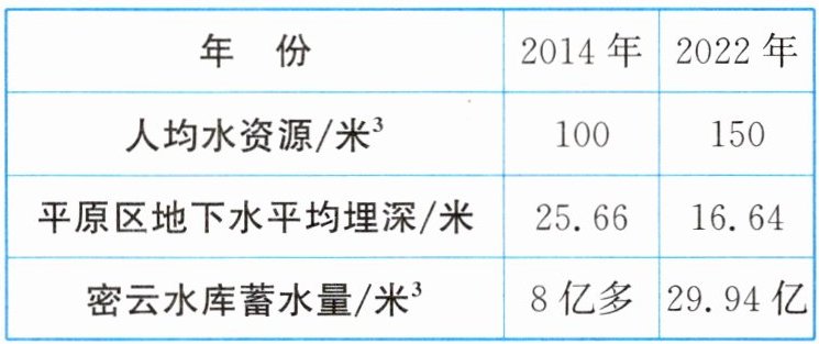 (3)依据表中资料,说出南水北调工程对北京水资源的影响。(至少答出两点)