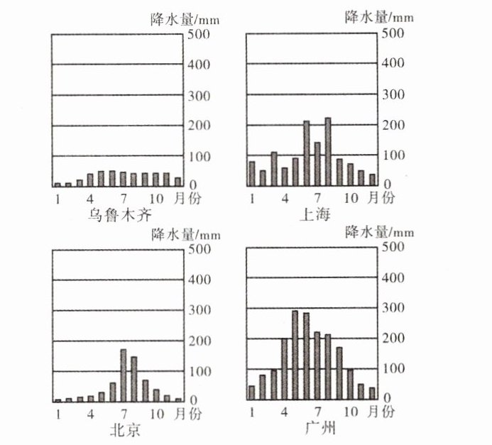 12. 水是人类赖以生存和发展的最重要的自然资源之一。如图为中国水资源分布示意图及部分城市降水量柱状图。阅读图文资料,回答下列问题。