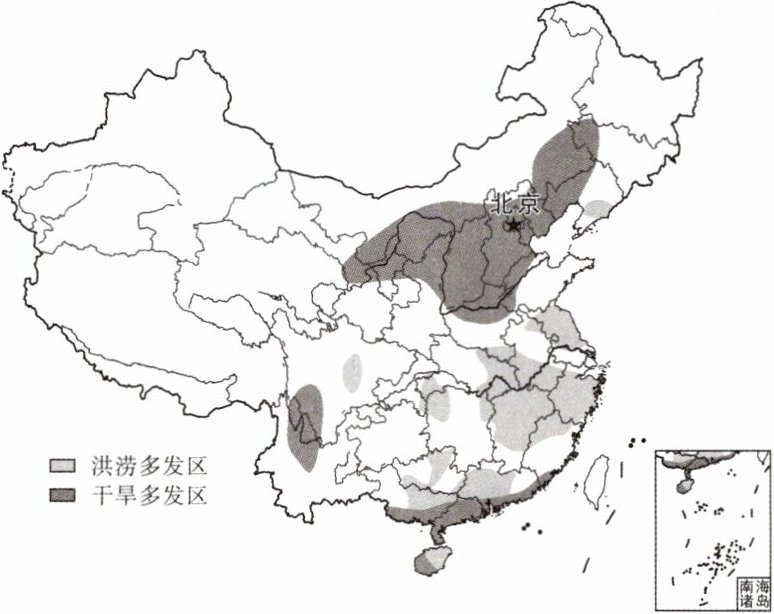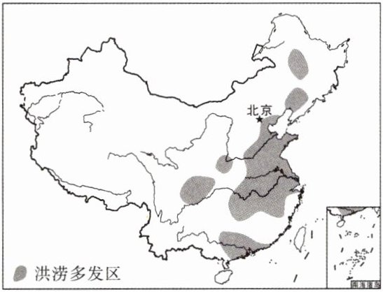 中国是个自然灾害多发的国家。下面是中国洪涝灾害分布图。读图,完成5~7题。