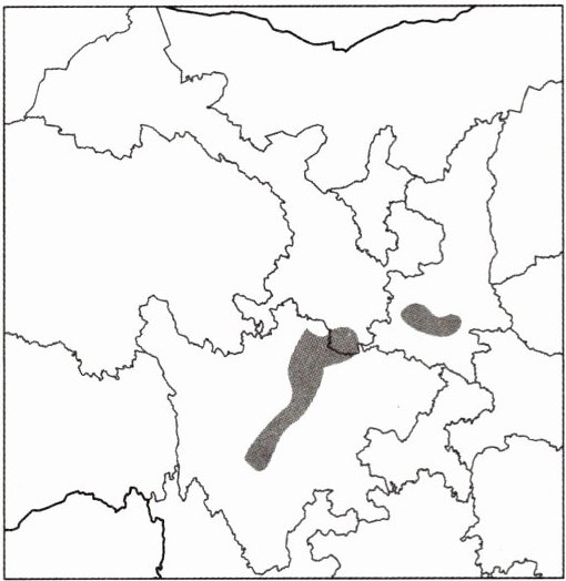 (2023.四川成都)2021年10月我国正式设立了大熊猫国家公园。大熊猫国家公园地处秦岭、岷山、邛崃山和大小相岭一带,如图阴影部分为该公园的分布范围。据此完成6~7题。