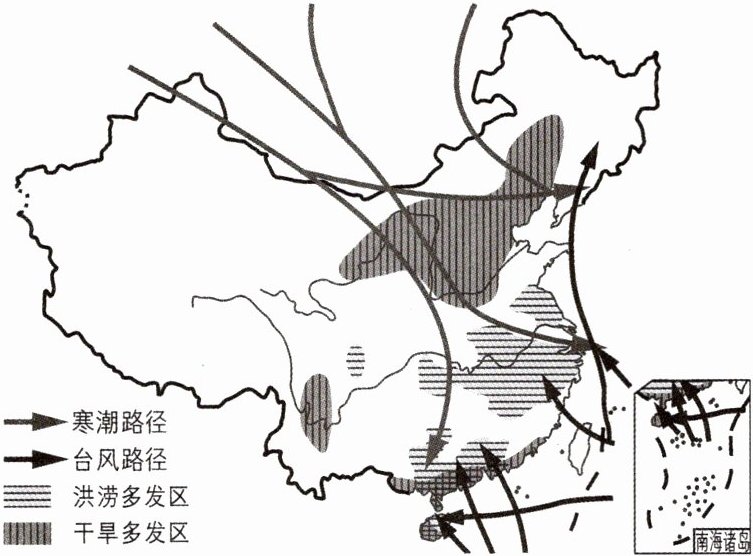 (2023.山东临沂)2022年,我国自然灾害以洪涝、干旱、风雹和地震灾害为主,台风、低温冷冻和沙尘暴等灾害也有不同程度发生。下图为中国主要气象灾害分布图。据此完成4~5题。