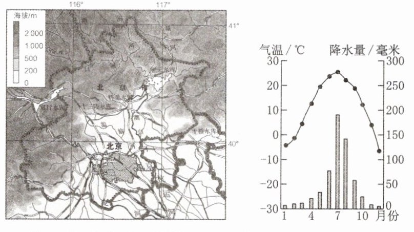 读北京市地形和水系分布图及气温曲线和降水量柱状图,完成4~5题。