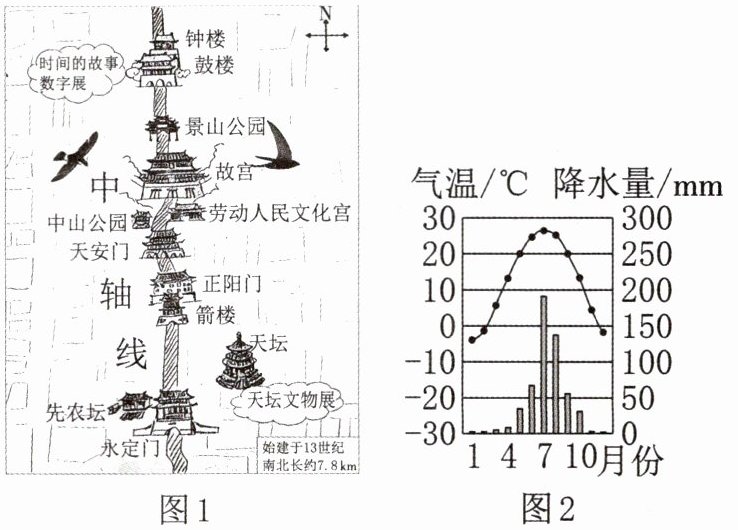 11.(教材P68“阅读”改编题)2023年1月,《北京中轴线保护管理规划(2022年—2035年)》正式公布实施。北京某中学开展主题为“走进中轴线”的主题调研,图1为某小组同学手绘的北京中轴线示意图,图2为北京市气温曲线和降水量柱状图。阅读图文资料,回答下列问题。