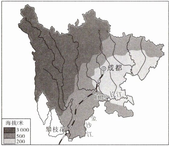 四川省地貌东西差异大,地形复杂多样,是我国西部的经济强省。读四川省地形图,完成1~2题。