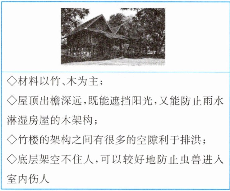 (2)干栏式民居大多分布在我国的西南地区,可适应当地______的气候条件。