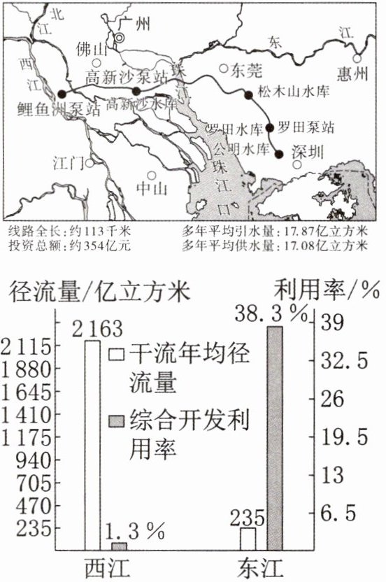 珠江三角洲水资源配置工程西起西江干流鲤鱼洲,东至深圳公明水库,全线采用深埋管道输水方式。项目建成后,将解决广州、深圳、东莞生产生活缺水问题,并为香港等地提供应急备用水源,为粤港澳大湾区发展提供战略支撑。读珠江三角洲水资源配置工程线路示意图和东江、西江水资源对比图,完成9~11题。